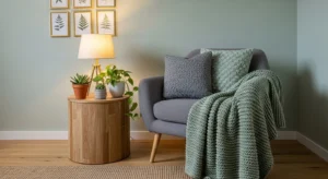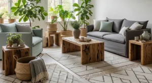 Neutral-toned sofas, wooden coffee tables, and rattan or natural fibre chairs complement sage and grey beautifully. Add throws and cushions in complementary tones to enhance warmth.